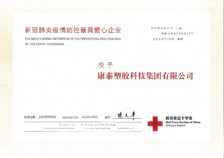2020.11康泰集團榮獲四川省“新冠肺炎疫情防控最具愛心企業(yè)”稱號近日,為表彰康泰塑膠科技集團在新冠疫情防控工作中的突出貢獻,四川省紅十字會授予集團“新冠肺炎疫情防控最具愛心企業(yè)”榮譽稱號。2020年1月,正當全國人民喜迎新春佳節(jié)時,一場突如其來的新型冠狀病毒肺炎疫情肆虐中華大地。面對新型冠狀病...閱讀人數(shù):7907 -
