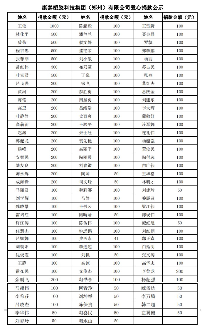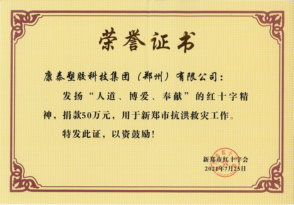 康泰塑膠科技集團(tuán)(鄭州)有限公司,作為康泰集團(tuán)全資子公司,自2005年成立以來,16年來,公司始終堅(jiān)持“扎根新鄭、服務(wù)華中”的經(jīng)營理念,在社會(huì)各界的關(guān)心關(guān)愛下,企業(yè)各項(xiàng)經(jīng)營事業(yè)均取得了長足的發(fā)展和進(jìn)步。在此,感謝鄭州市委市政府、新鄭市委市政府,以及全體新鄭人民的支持和關(guān)心。雖然,鄭州子公司也在此次洪災(zāi)中遭受了不同程度的損失,但是,鄭州子公司對(duì)新鄭人民的受災(zāi)感同身受,在自身受原材料價(jià)格暴漲,企業(yè)經(jīng)營面臨挑戰(zhàn)的情況下,依然積極履行社會(huì)責(zé)任,為河南抗洪救災(zāi)略盡綿薄之力。公司全體員工也自發(fā)捐款,點(diǎn)點(diǎn)愛心,匯聚成河,無私助人,溫暖真情。共同祝愿河南人民早日恢復(fù)正常生產(chǎn)生活,文化河南,壯美中原。