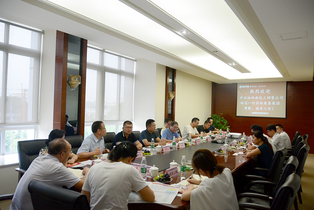 6月25日下午,中石油西南化工銷售公司總經(jīng)理孫克棟率領(lǐng)四川石化、獨(dú)山子石化相關(guān)負(fù)責(zé)人一行蒞臨康泰參觀考察??堤┘瘓F(tuán)董事長(zhǎng)兼總裁林云青,副總裁張文霖,采供中心總監(jiān)潘云琴熱情歡迎領(lǐng)導(dǎo)的到來并座談。