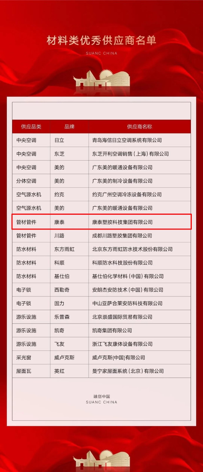 5月7日,融創(chuàng)中國通過融享供應(yīng)商交互平臺(tái)公布了“2019年度優(yōu)秀供應(yīng)商名單”。康泰集團(tuán)獲得了管材管件材料類優(yōu)秀供應(yīng)商稱號(hào)。“融創(chuàng)中國2019年度優(yōu)秀供應(yīng)商”由材料類和施工類組成,材料類優(yōu)秀供應(yīng)商分為管材管件、防水材料、中央空調(diào)等40種供應(yīng)品類。