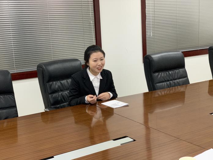 圖為銷售中心王珊向同學(xué)們講解公司榮譽(yù)