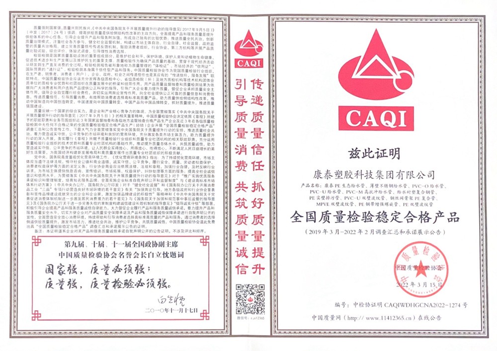 獲得這些榮譽(yù)獎(jiǎng)項(xiàng)是中國(guó)質(zhì)量檢驗(yàn)協(xié)會(huì)與消費(fèi)者對(duì)康泰塑膠產(chǎn)品品質(zhì)、服務(wù)質(zhì)量、品牌口碑的一致肯定,也是對(duì)康泰產(chǎn)品和實(shí)力的贊許與認(rèn)可。這也激勵(lì)著康泰繼續(xù)秉持“為智慧城市建設(shè)提供生態(tài)管道系統(tǒng)”的企業(yè)使命,在追求專業(yè)與一流品質(zhì)的路上不斷攀登高峰,為消費(fèi)者提供更加優(yōu)質(zhì)的產(chǎn)品和服務(wù),為中國(guó)塑膠行業(yè)樹立一個(gè)嶄新的標(biāo)桿。