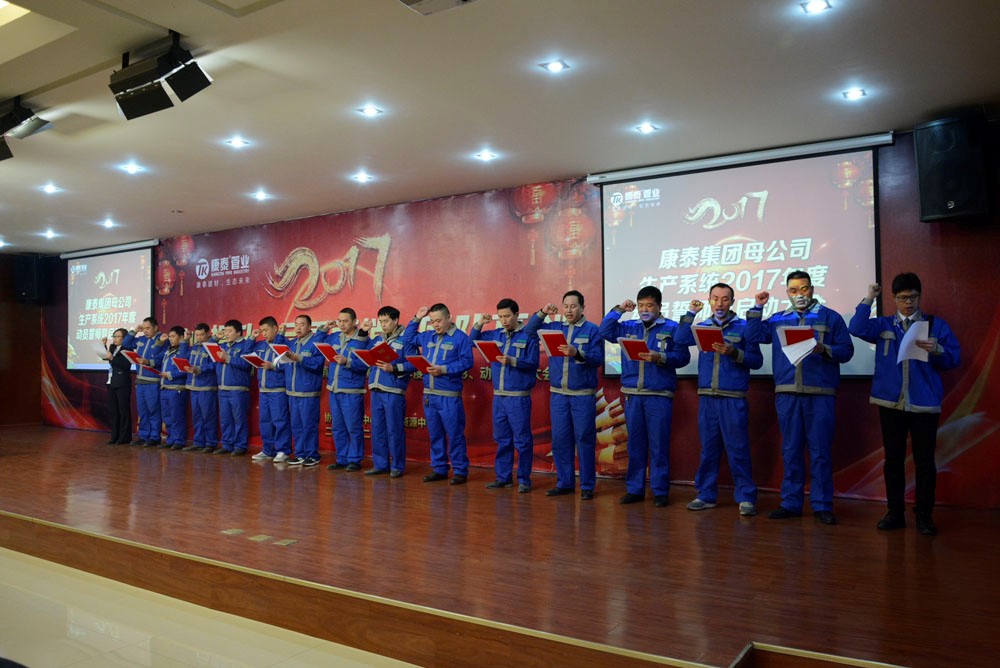 ? ? ? ?為清晰傳遞公司發(fā)展戰(zhàn)略,有效提升產(chǎn)品配套齊全、性價比優(yōu)、質(zhì)量穩(wěn)定受控的生產(chǎn)后勤保障優(yōu)勢,2月22日下午,由生產(chǎn)中心主辦,人力資源中心、市場中心協(xié)辦的“康泰集團2017年度生產(chǎn)系統(tǒng)保障動員誓師大會”在集團總部召開??堤┘瘓F董事長兼總裁林云青,以及集團副總裁、各中心總監(jiān)和中層以上干部、車間班組長、車間員工代表等100多人參加會議。