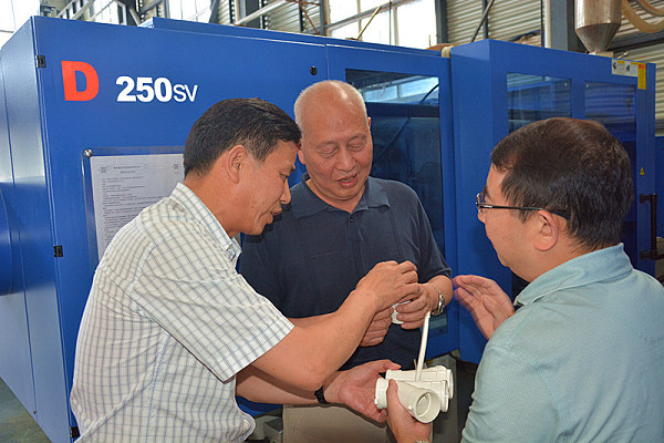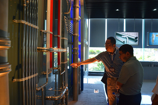 ??? 6日下午2點(diǎn),考察團(tuán)一行抵達(dá)集團(tuán)公司,在林總裁的帶領(lǐng)下,考察團(tuán)首先參觀了公司生產(chǎn)車間,其中重點(diǎn)參觀考察 了成品庫(kù)房、管件車間、自動(dòng)卸料系統(tǒng)、模具事業(yè)部、燃?xì)馍a(chǎn)線、技術(shù)研發(fā)中心、不銹鋼公司給水部及展廳、集團(tuán)公司展廳。