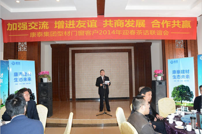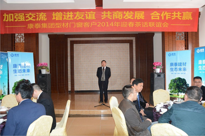 ??? 當(dāng)日,以“加強(qiáng)交流、增進(jìn)友誼、共商發(fā)展、合作共贏”康泰集團(tuán)型材門(mén)窗客戶2014年迎春茶話聯(lián)誼會(huì)在美麗的街子古鎮(zhèn)味江味花園飯店隆重召開(kāi),一百多名客戶參加了此次聯(lián)誼會(huì),集團(tuán)公司林總裁、品牌總監(jiān)鄭光鏵、型材事業(yè)部總經(jīng)理陳彪出席本次聯(lián)誼會(huì)。