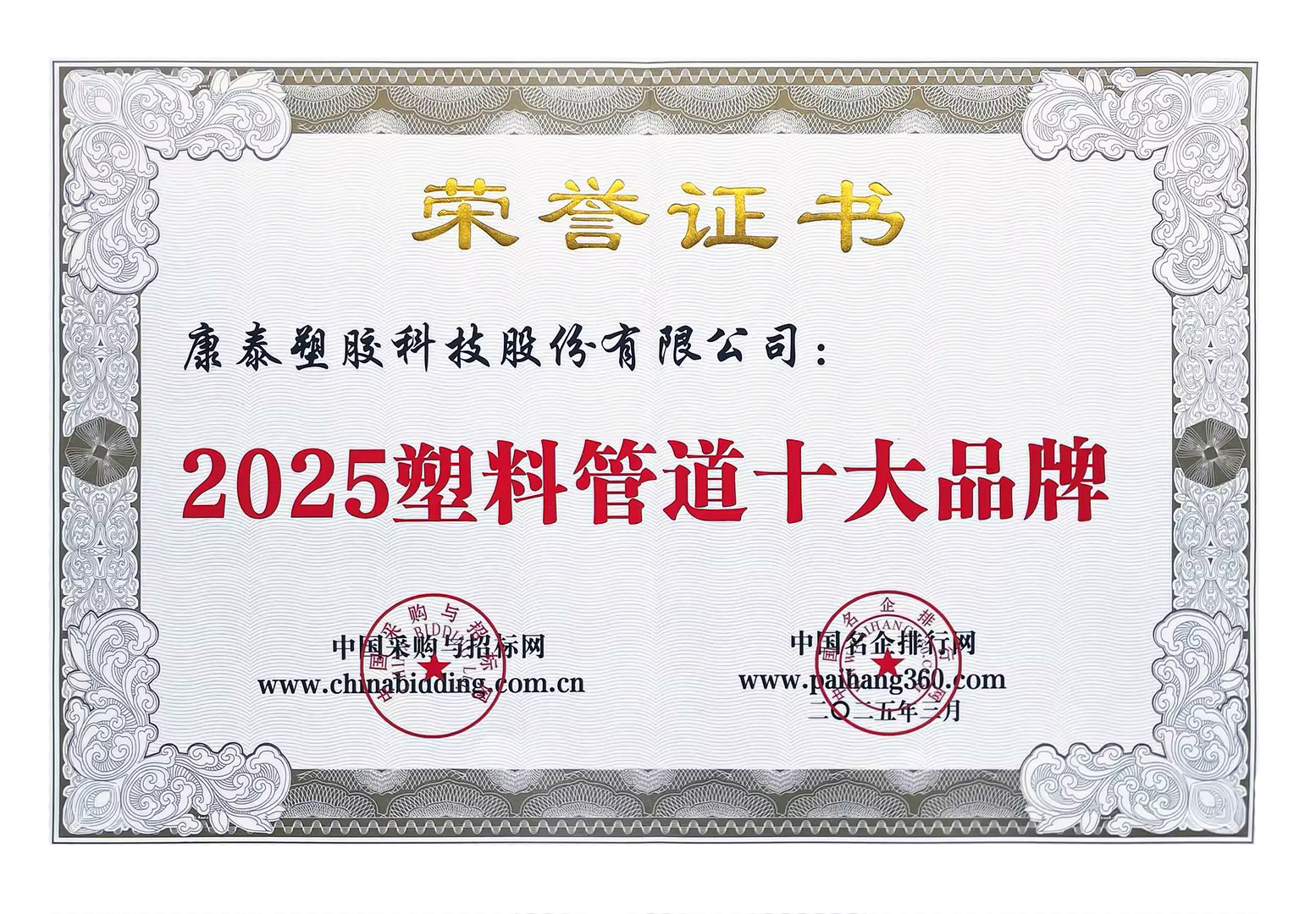 康泰集團(tuán)榮獲“2025塑料管道十大品牌”、“2025家裝管道十大品牌”等稱號(hào)2025/03/24 4992日前,在中國(guó)采購(gòu)與招標(biāo)網(wǎng)、中國(guó)名企排行網(wǎng)聯(lián)合主辦的中國(guó)塑料管道評(píng)價(jià)活動(dòng)...read more -