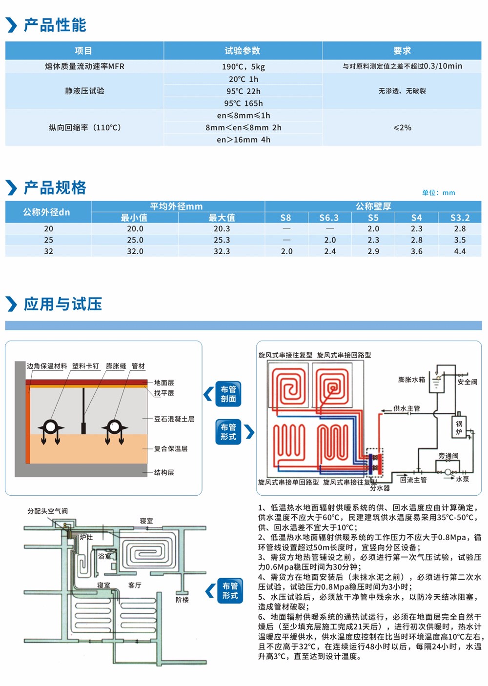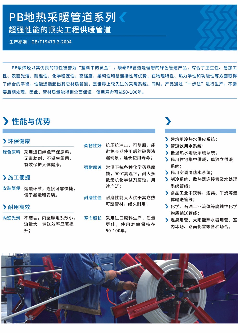 從結(jié)構(gòu)上來看,聚丁烯(PB) 是一種線性的半結(jié)晶性熱塑性材料,是一種高分子惰性聚合物,是世界上最先進(jìn)的化學(xué)材料之一。加工和使用過程中無毒無污染,可以反復(fù)加熱成型。聚丁烯(PB)綜合了衛(wèi)生性、加工性、表面光潔度、耐溫性、化學(xué)穩(wěn)定性、強(qiáng)度、柔韌性和易連接性等優(yōu)勢,在物理特性、熱力學(xué)特性和功能性等方面取得了綜合的平衡,從而賦予了PB地?zé)岵膳芄懿闹T多得天獨(dú)厚的特質(zhì),能夠用于流體輸送系統(tǒng),尤其在建筑內(nèi)的熱水輸送系統(tǒng)領(lǐng)域開辟了廣闊的用武之地,PB管道是世界上較先進(jìn)的采暖系統(tǒng),他的優(yōu)良特性被越來越多的人關(guān)注,被譽(yù)為“塑料中的黃金”。 聚丁烯(PB)管材是目前較理想的地板采暖管材和冷熱水管材,其性能遠(yuǎn)遠(yuǎn)超出其它管材的,我公司生產(chǎn)的新型PB地板采暖管,采用PB專用料生產(chǎn),因此材質(zhì)是十分可靠的。PB管道的生產(chǎn),實(shí)現(xiàn)了真正的“一步法”,它不需要后期處理,因此,管材質(zhì)量能得到全面保證,使用壽命可達(dá)50年-100年。