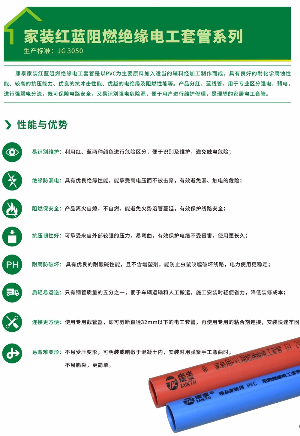 康泰家裝紅藍阻燃絕緣電工套管是以PVC為主要原料加入適當?shù)妮o料經(jīng)加工制作而成,具有良好的耐化學(xué)腐蝕性能、較高的抗壓能力、優(yōu)良的抗沖擊性能、優(yōu)越的電絕緣及阻燃性能等。產(chǎn)品分紅、藍線管,用于專業(yè)區(qū)分強電、弱電,進行強弱電分流,既可保障電路安全,又易識別強電危險源,便于用戶進行維護修理,是理想的家居電工套管。